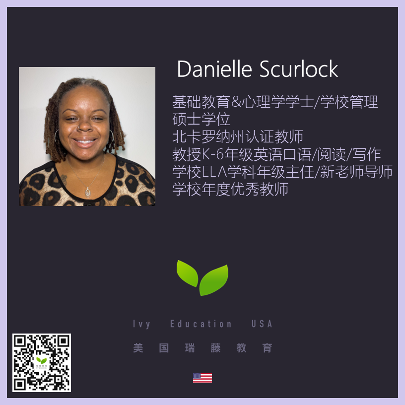 嗨,我叫Danielle Scurlock,住在北卡罗来纳州。我拥有心理学学位,主修现代社会学,还有小学教育学位。我在北卡罗来纳州获得了幼儿园到六年级的教师资格证。目前我在同一所学校教了十年书。我最喜欢教的科目是阅读和社会学。我教过二年级、四年级和五年级,最喜欢教四年级。过去四年我一直担任英语语言学学科的年级组长。我认为学生有各种各样的学习方式。所以我的课堂环境包括提问、回答问题、朗读、和学生之间的交流,以及让学生在课堂上以最适合自己的方式学习。我也觉得学生应该享受课堂的乐趣。孩子们来上课,学习,同时也能感受到快乐,并期待着第二天的到来!我期待着与您和您的家人合作,迫不及待地想收到您的消息!