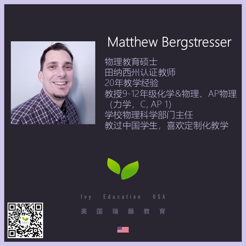 你好,我是Matt Bergstresser。你可以和我一起走过美国大烟山和田纳西州东部的山麓。我是一名经过认证的化学和物理教师,我已经在高中教学20年了。我教科学的方法就是解决问题,不要死记硬背,学习如何使用原则,然后从这些原则中找到解决方案。这是在任何标准化考试中取得好成绩的最好方法,比如AP考试、ACT或SAT考试。死记硬背不会让你走得太远,所以我尽量避免死记硬背,教学生如何思考,思考是解决问题的唯一办法。如果你想学习更多关于物理和化学的知识,并打算参加AP考试,来跟我学习吧,我会助你达成目标!