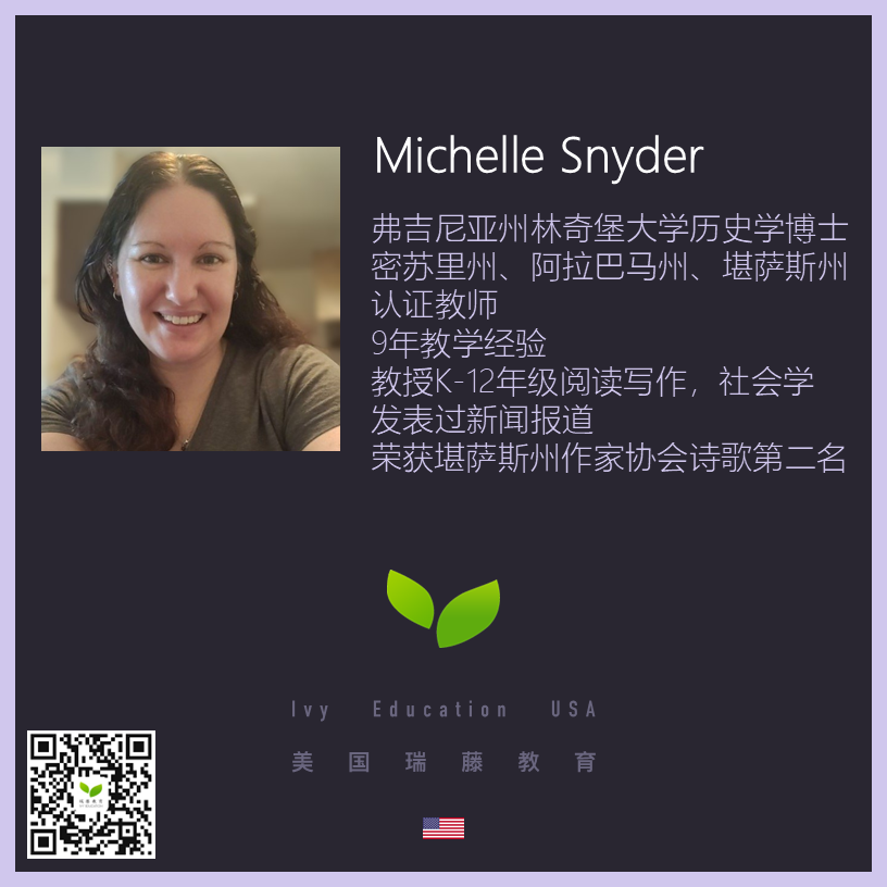 你好,我是Michelle老师,我来自美国。我当老师已经十年了,教过从三岁到二十岁的学生。我在美国的公立学校教过书,在日本的语言中心工作过,现在在越南的一所私立学校任教。我当过英语作为第二语言(ESL)的老师,也当过英语语言艺术(ELA)老师,我可以帮助你学习如何流利地说英语以及有效地写作。我还能带你学习如何找出书中的情节和细节。我最喜欢的年级是我们所说的初中,也就是六年级、七年级和八年级,这些年级的学生真正开始深入学习文学,并且学习如何有效地写作。我大部分的教学经验都是教这些年级。不过现在我在越南教二年级,我们正在学习如何把句子写得更长更好。我的教学理念是,如果你感到无聊,那我也会无聊,这样我们就学不到什么东西。我希望你能兴奋起来。我希望你知道自己做得很好,正在尽自己最大的努力,所以我在课堂上总是充满活力。我有很多游戏、活动和内容能让你所学的知识与你自身相关联。作为教师,我的目标是我的课堂将如何在未来帮助到你。您想和我一起学习什么呢?你需要提高哪些方面?欢迎告诉我!非常感谢你的收听,希望很快能见到你。再见!