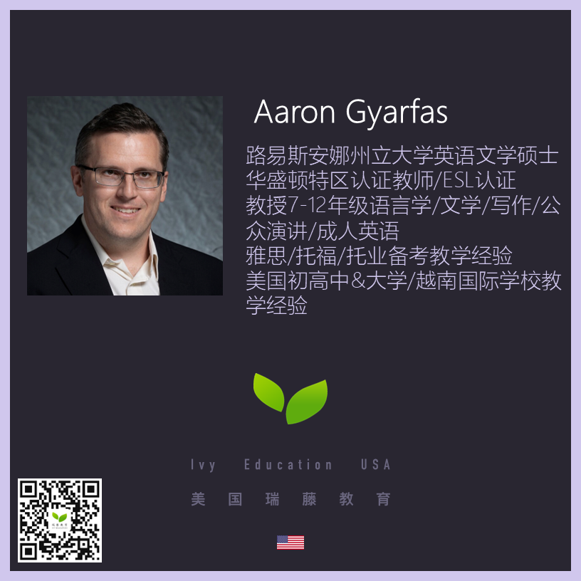 你好,我叫Aaron Gyarfas,我的学生通常都叫我Mr. Aaron. 我从 2011年开始教书。我教过英语,主要是作为第二语言(ESL),还教过学术写作、技术写作(大学课程)、语法和托福考试等课程。我最初的四年教书生涯是在越南度过的,其中包括在河内的一所国际学校教了一年的五年级,在那里我的大儿子出生了。我有三个儿子,我享受和他们在一起的时光,就像享受和学生在一起的时光一样!我拥有路易斯安那州立大学的新闻学学士和英语硕士学位,我的教师资格证是华盛顿特区颁发的,教七到十二年级的英语。我教过来自世界各地的学生,包括中国的学生。作为一名教师,我的目标和你们的目标是一致的,那就是帮助你们实现你们所追求的目标。作为教师,没有什么比看到我的学生取得成功更让我感到自豪的了!所以,我希望我们能一起走向成功!